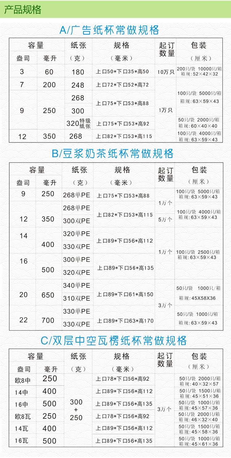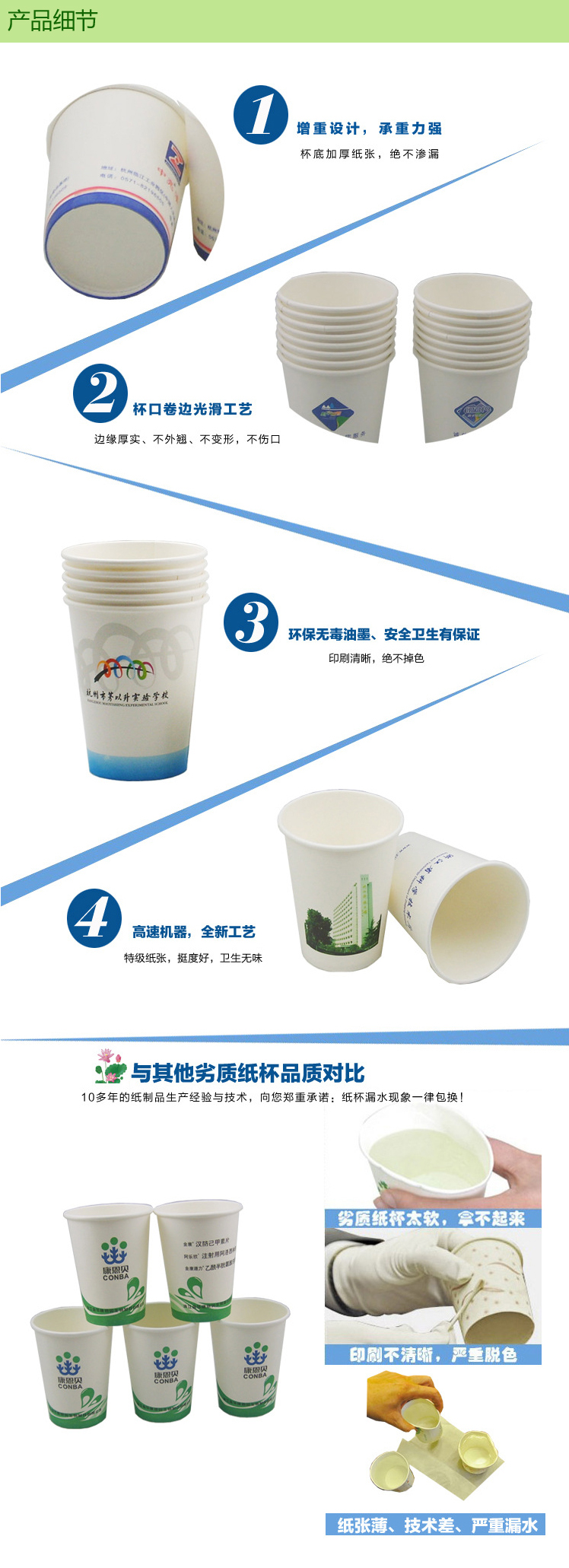 選擇我們的優勢:耐高溫、不滲漏、不做熒光漂白處理、無異味、紙杯增厚、可免杯托、柔版印刷,環保油墨